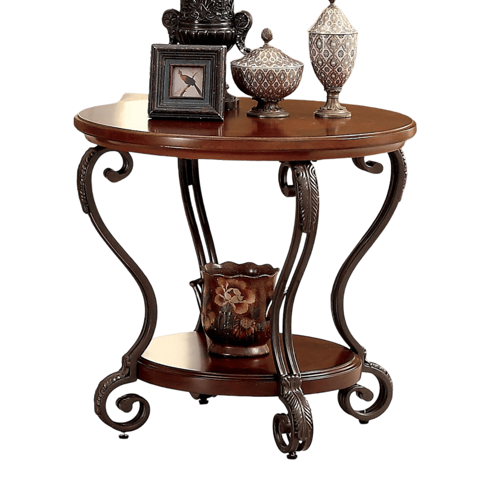 Description:-The ornate designs supporting and decorating each accent table will surely update any living space. Scroll detailing found along the metal legs creates a sophisticated appeal, drawing attention to the open shelves below.Listing includes - 1pc End Table only.Coffee Table And Sofa Table are Not Included.Dimensions-1x Sofa Table - 28"L X 28"W X 26 1/2"HFeatures :-Traditional StyleBrown CherryMetal, WoodOrnate DesignScroll Detail LegsSimple Assembly Required.