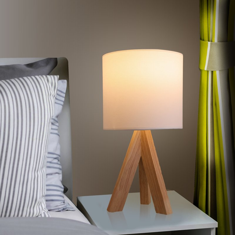 Brighten any room in your home or office with this Tripod Oak Table Lamp with Classic White Fabric Shade. This shape was inspired by the chic and contemporary style. The Base is crafted with a sleek and stylish natural oak wooden tripod base this lamp would suit any dcor. Measuring 16.75-inches in height this elegant lighting solution adds a unique and elegance to any home living room accent tables, bedside nightstand, or office desks. This lamp can be compatible with a standard A19 light bulb with medium screw base (E26), so you have total flexibility to light your space as you prefer with a variety of incandescent, halogen bulbs, LED or CFL light bulbs. Control the lamp easy to use, just plug in the outlet and use the power toggle on and off. Show off this Tripod Oak Table Lamp with Classic White Fabric Shade from .