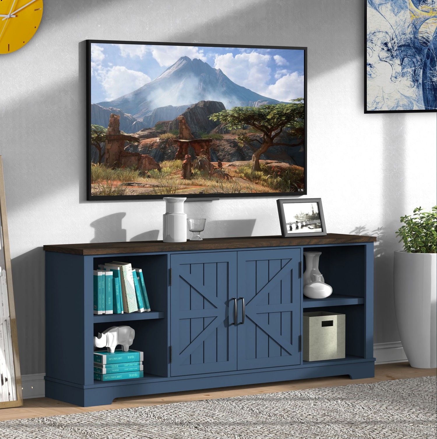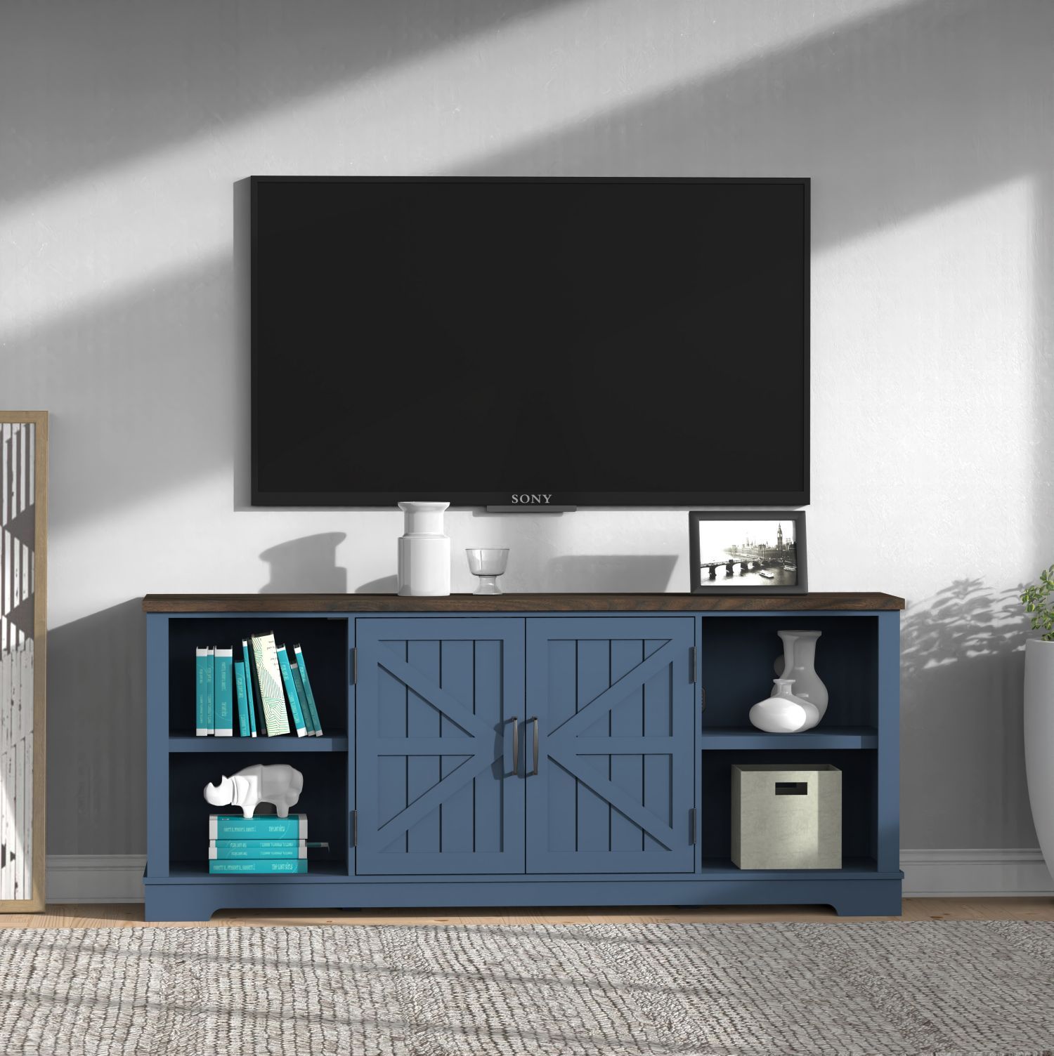 1.Farmhouse Style TV stand: This media console cabinet can be used as a TV stand to support flat screen TVs up to 80", suitable for most home TV placement. If you like, it can also serve as a storage cabinet to show your family photos and potted plants.