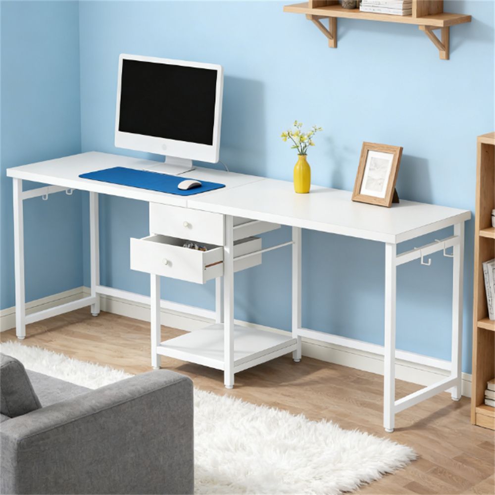 Extra-Large Dual Workstation - Our two-person desk offers a spacious platform for collaborative work. It features two drawers for organization, an open shelf for CPU protection, and handy iron hooks for headphones or backpacks. Anti-scratch, non-slip pads ensure floor protection and noise reduction.