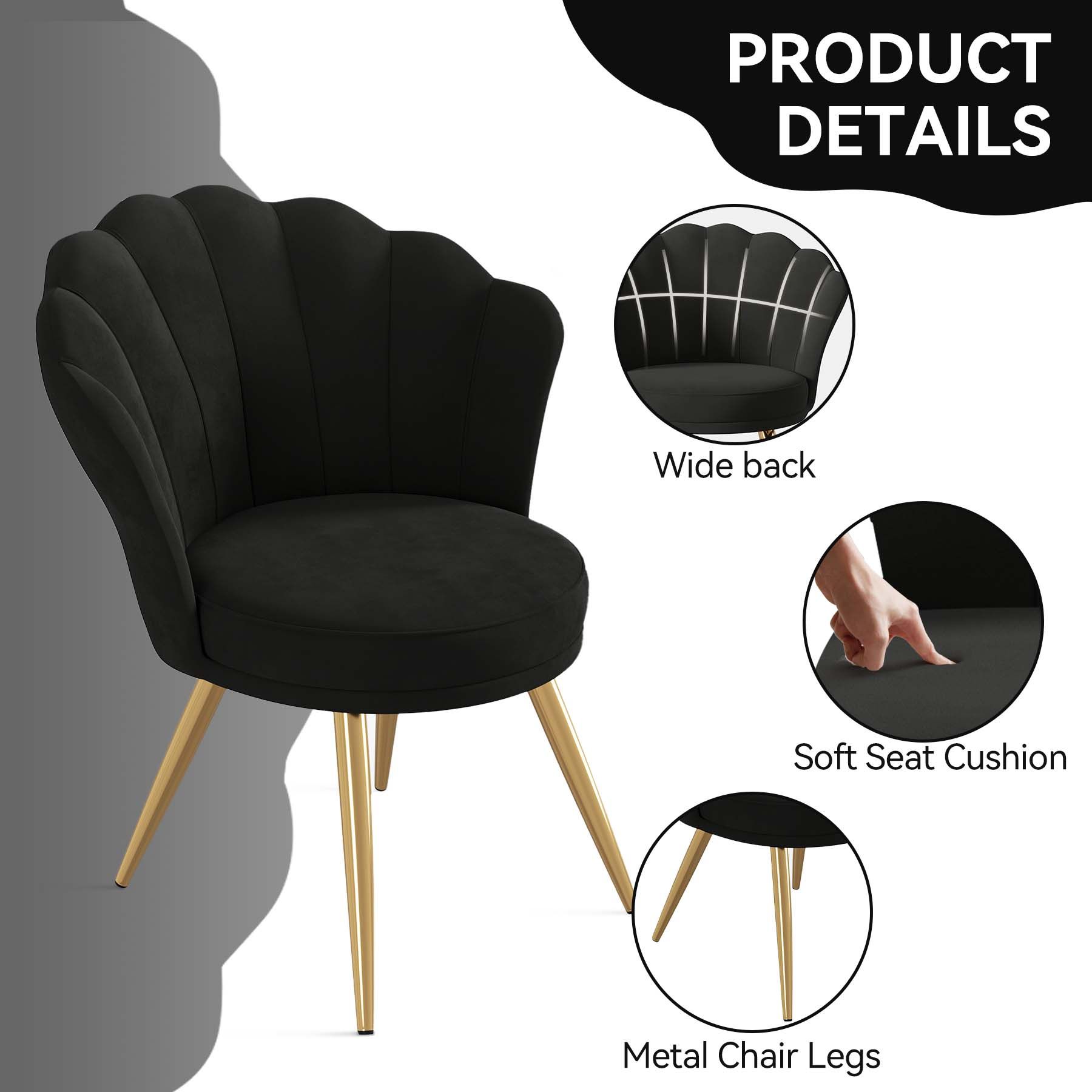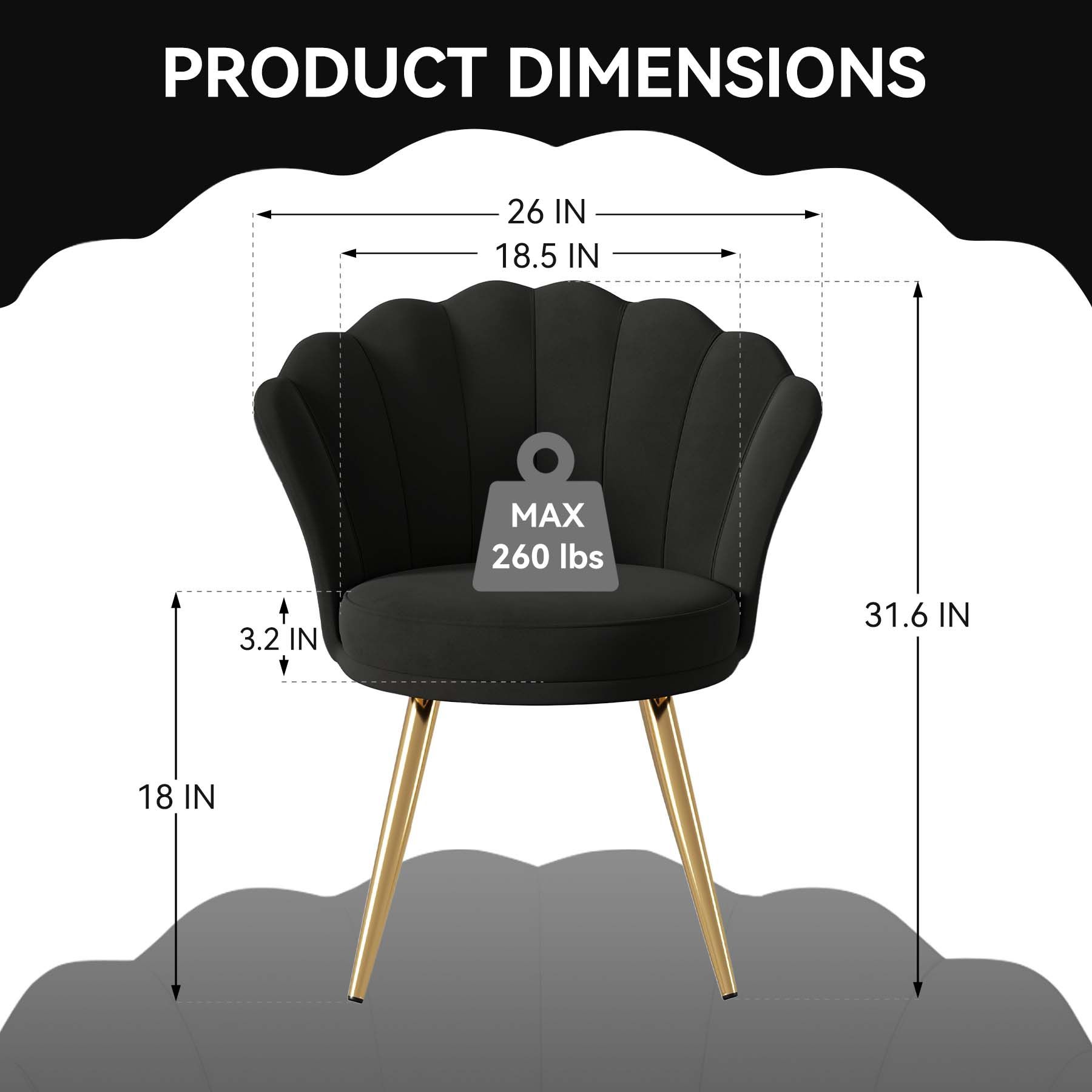 Elegant Velvet Chair This vanity chair features a beautiful shell-shaped design with graceful curves, soft velvet upholstery, and luxurious golden legs. It exudes timeless style and elegance, making it the perfect addition to any room. Whether used as a guest chair, vanity chair, or accent chair, it adds a cloud-like softness and a touch of sophistication to your space.