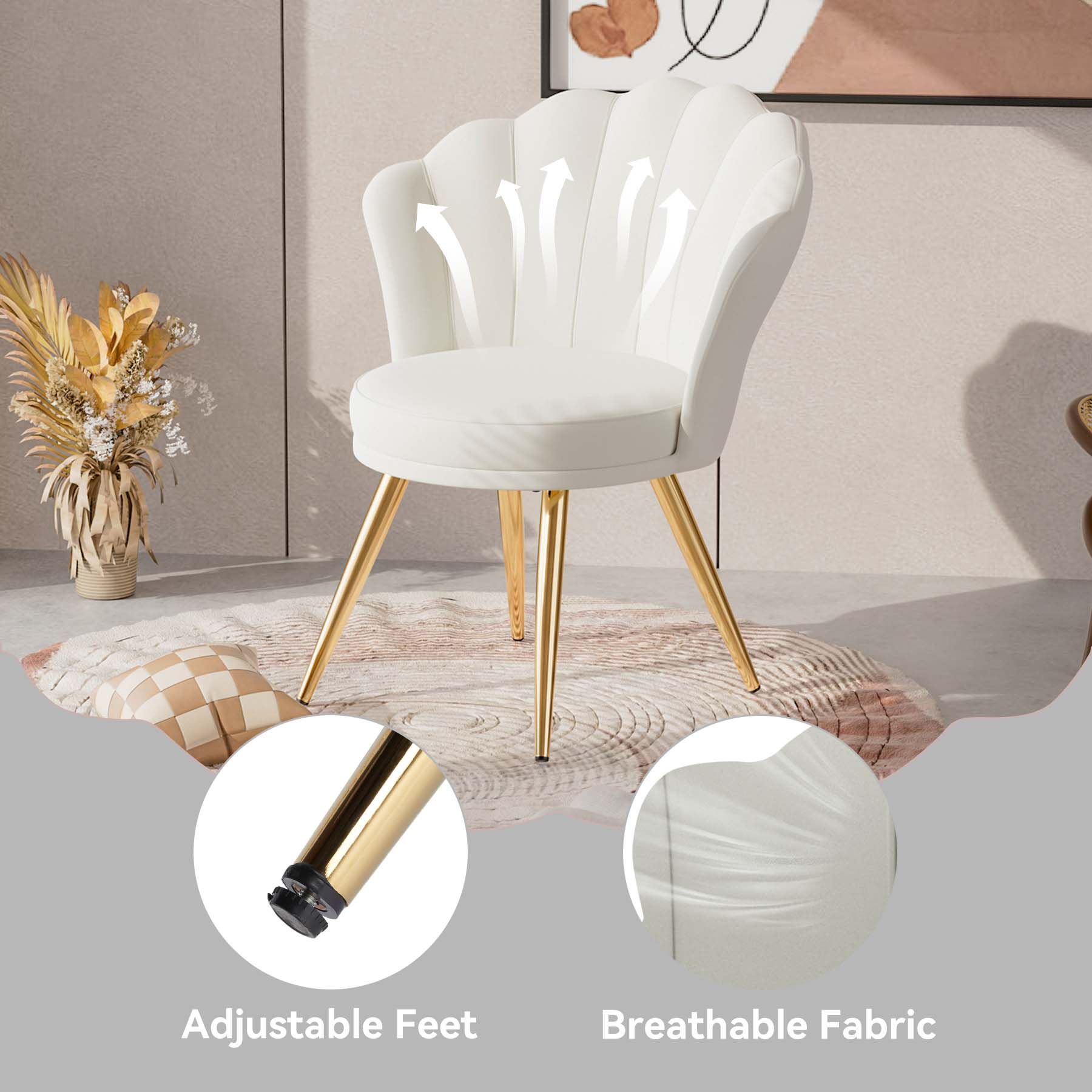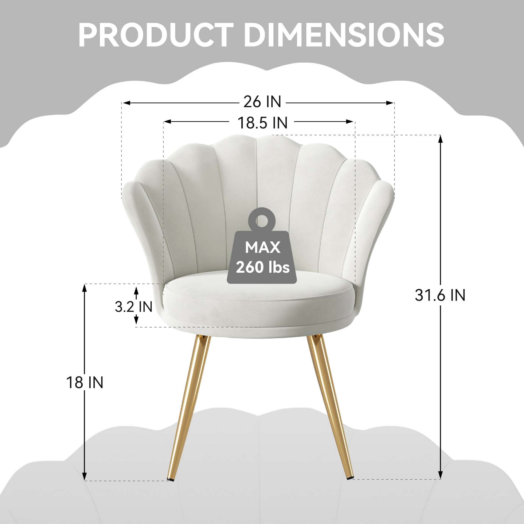 Elegant Velvet Chair This vanity chair features a beautiful shell-shaped design with graceful curves, soft velvet upholstery, and luxurious golden legs. It exudes timeless style and elegance, making it the perfect addition to any room. Whether used as a guest chair, vanity chair, or accent chair, it adds a cloud-like softness and a touch of sophistication to your space.