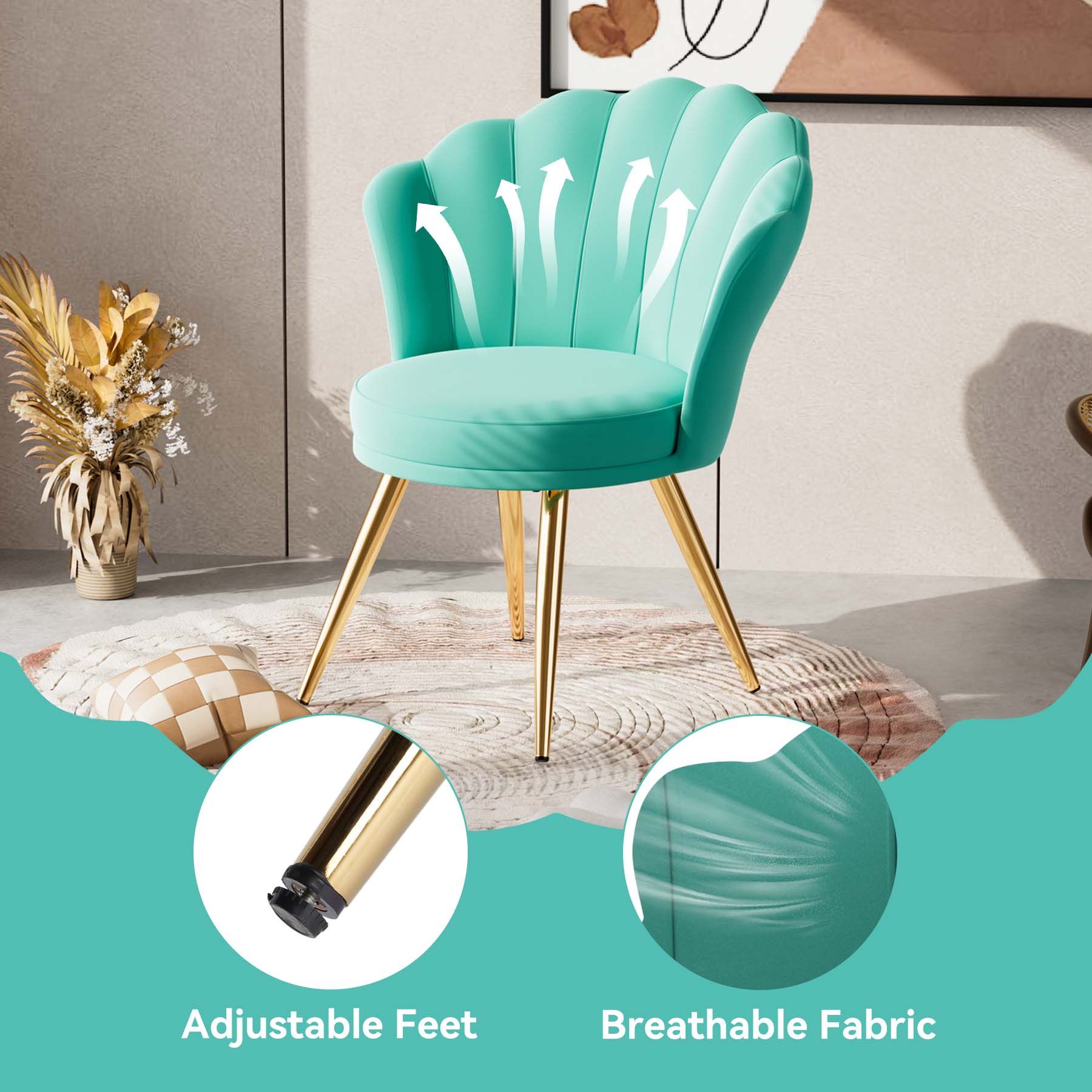 Elegant Velvet Chair This vanity chair features a beautiful shell-shaped design with graceful curves, soft velvet upholstery, and luxurious golden legs. It exudes timeless style and elegance, making it the perfect addition to any room. Whether used as a guest chair, vanity chair, or accent chair, it adds a cloud-like softness and a touch of sophistication to your space.