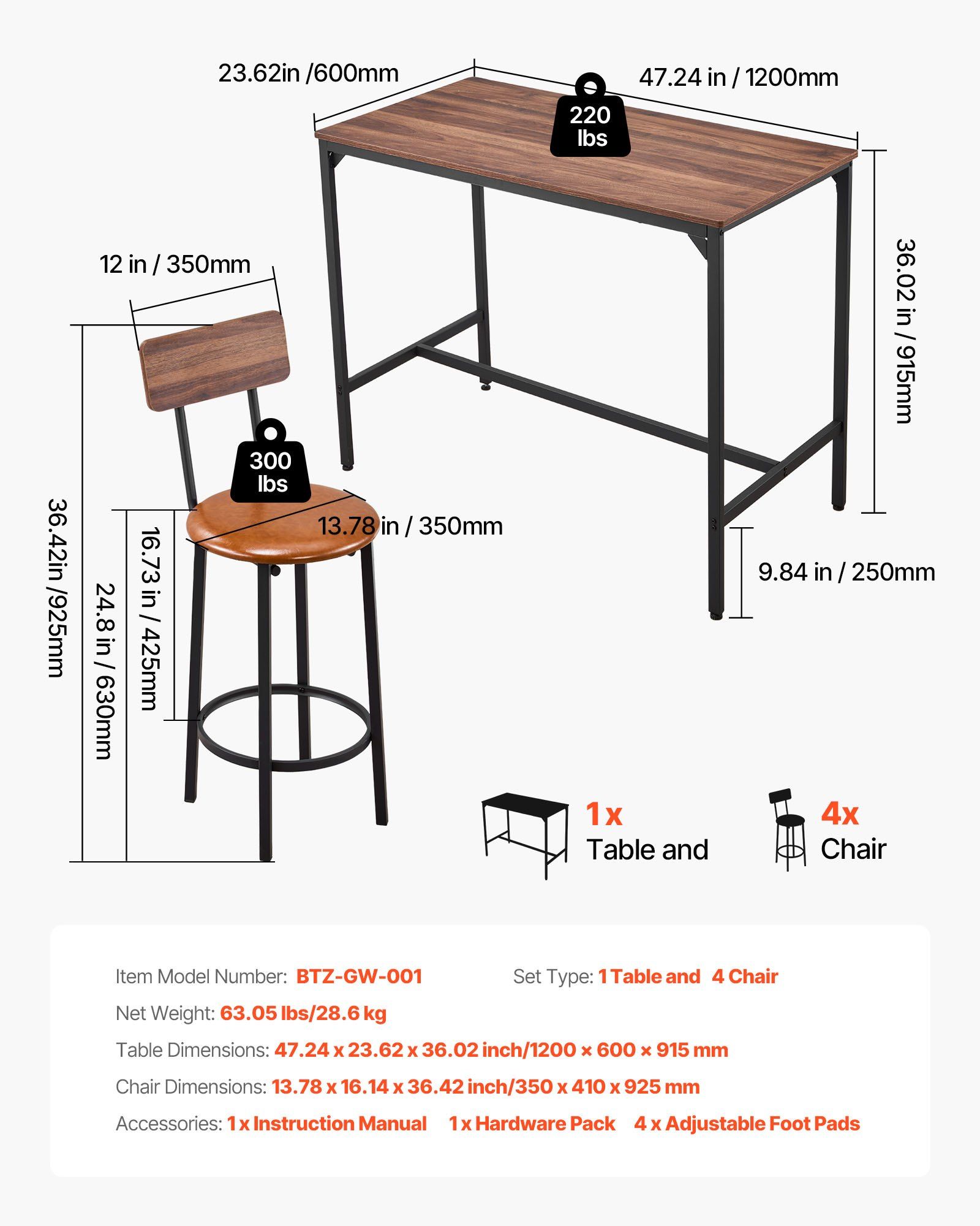 1.5-Pc Table & Chair Set: Our rectangular pub table with stool includes 1 table (47.24 x 23.62 x 36.02 in/1200 x 600 x 915 mm) and 4 backed chairs (13.78 x 16.14 x 36.42 in/350 x 410 x 925 mm) for groups. Its ideal height provides a more relaxed experience