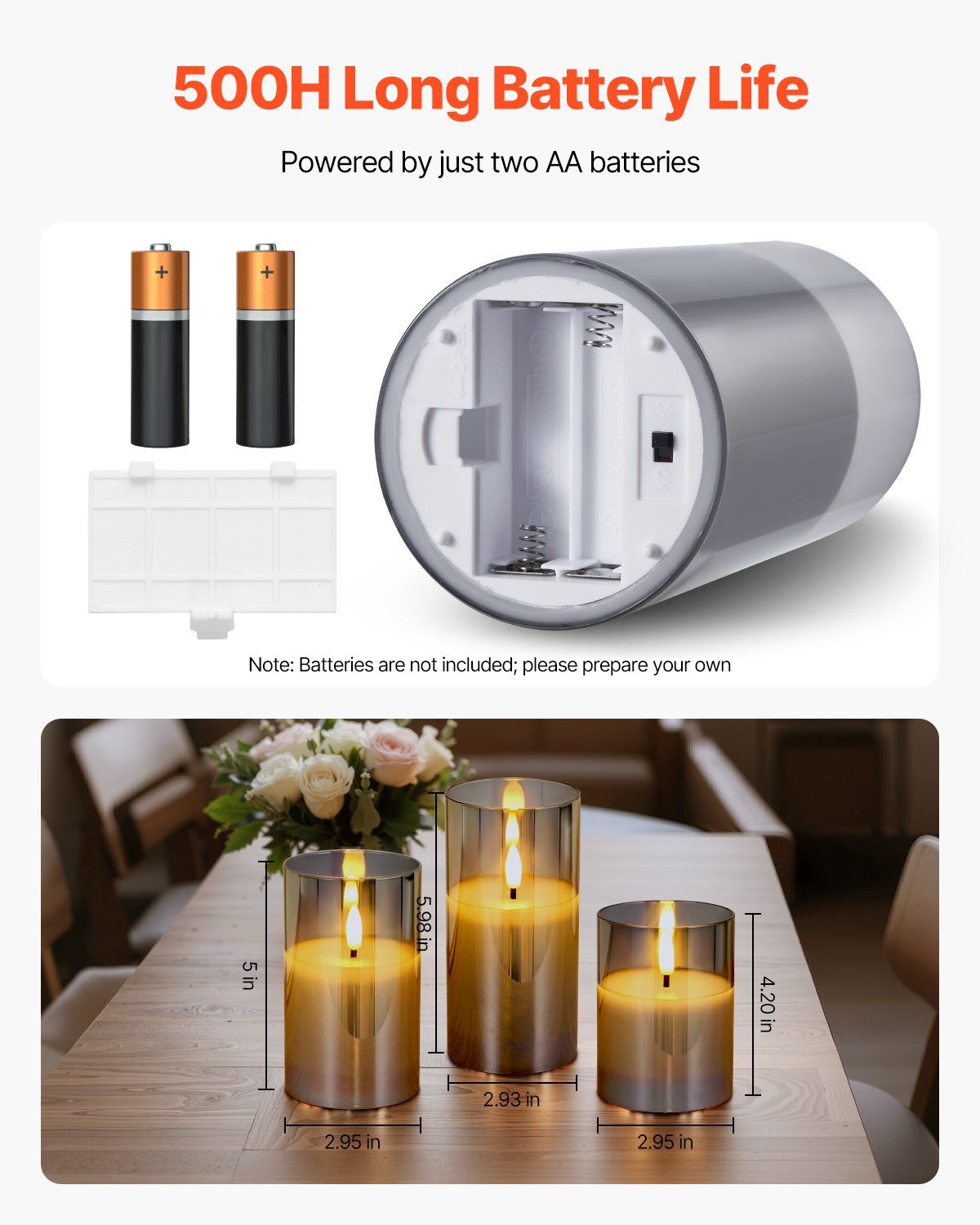 2.500-hour Long Battery Life: Powered by just two AA batteries, these flickering flameless candles last up to 500 hours! With the timer cycle, they can last over two months-just replace the batteries and enjoy years of use!