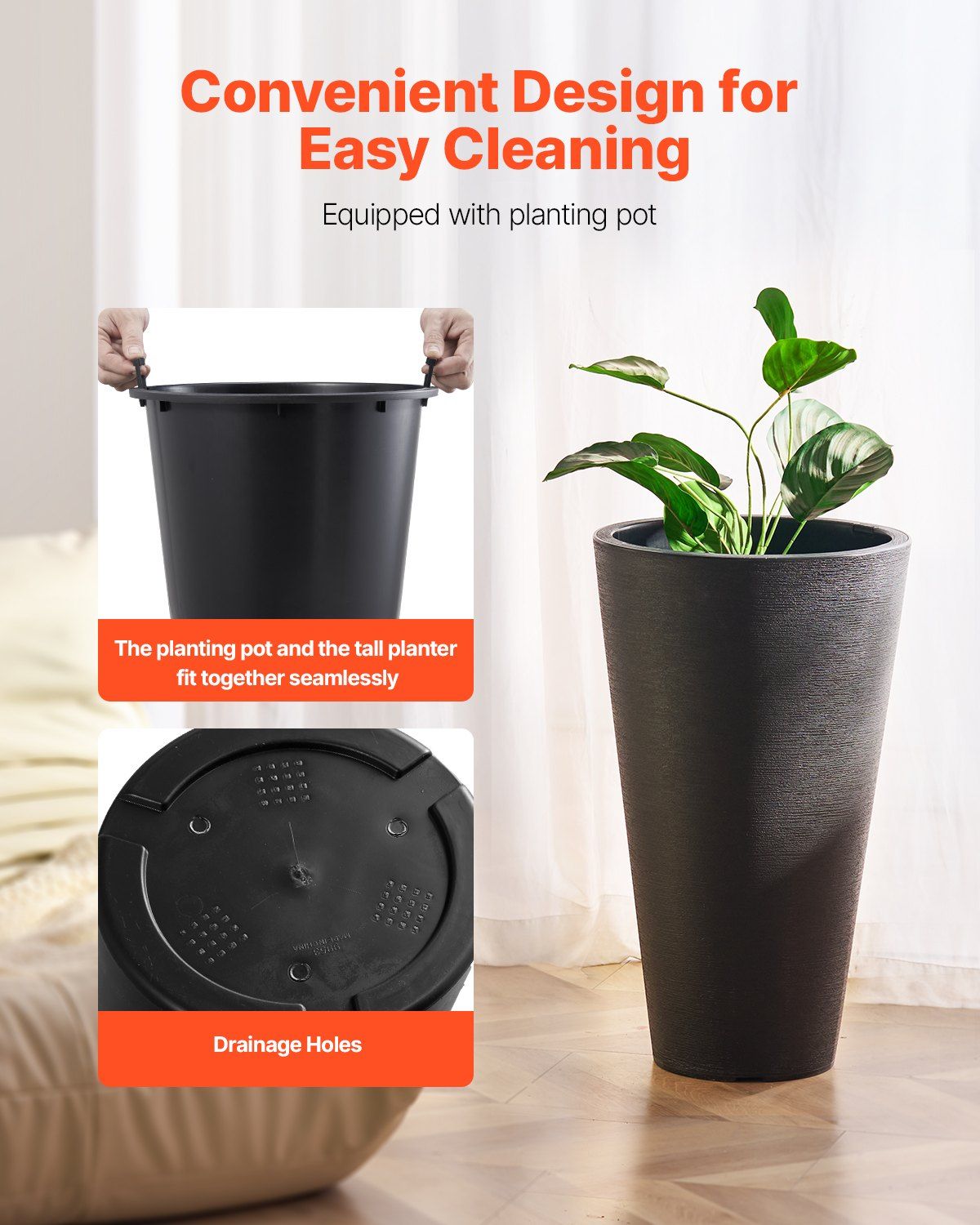 1.Built-In Planting Box: This tall planter includes a convenient planting box, letting you choose between potted plants or soil-based gardening. The side pull-ring design makes removal and cleaning a breeze, ideal for balconies, patios, or indoor spaces.