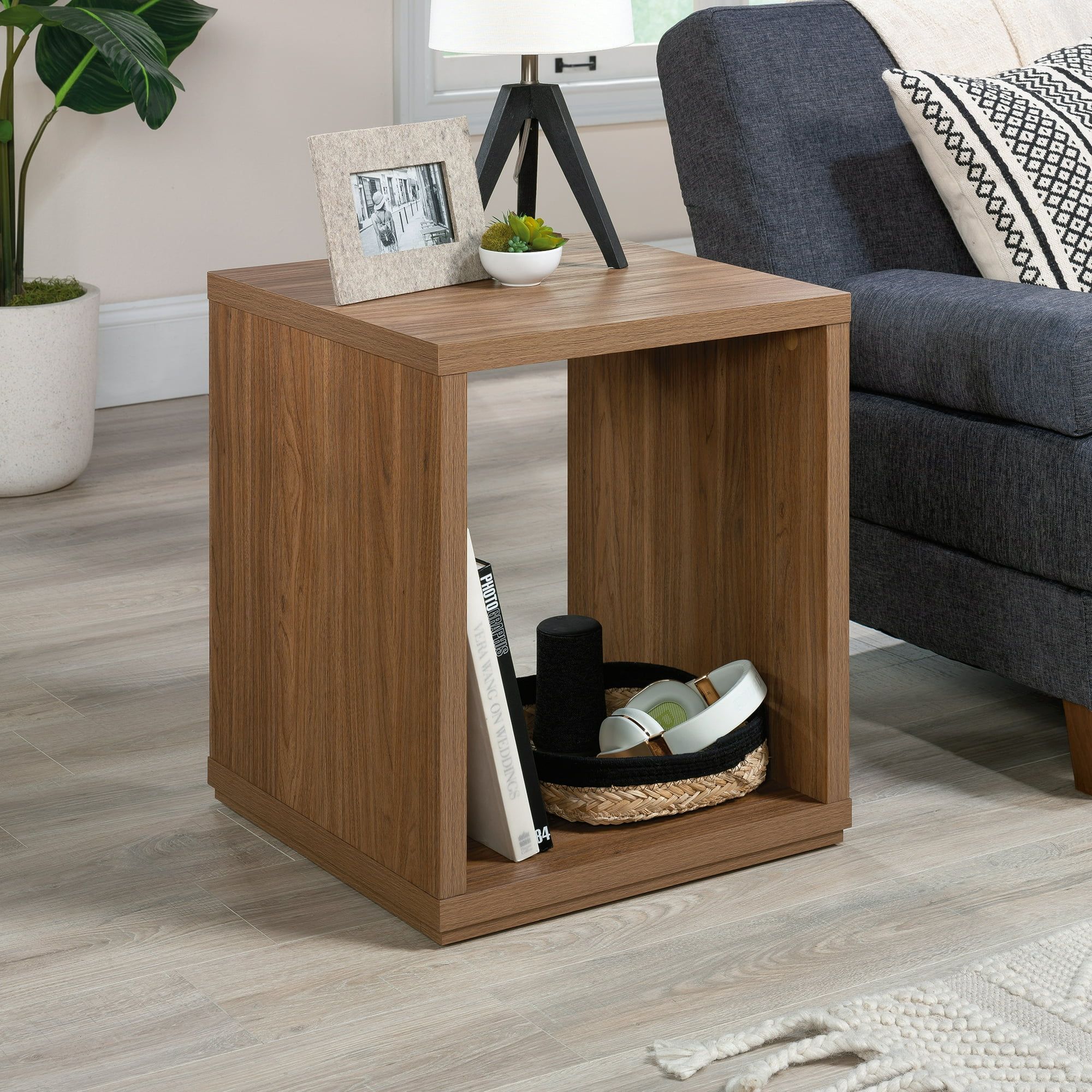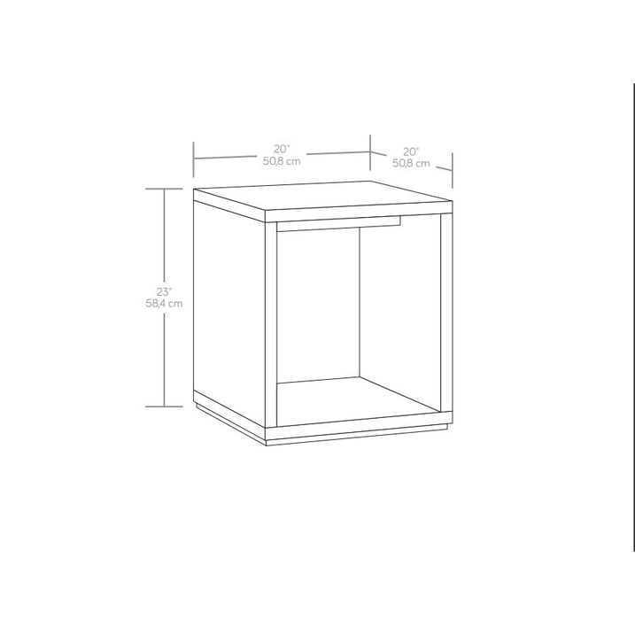 Compact Dimensions: The end table measures 20.00 inches in length, 20.00 inches in width, and 22.99 inches in height when assembled.Sturdy Construction: Features strong and lightweight 1 1/4 inch panel construction for durability.Ample Storage: Includes two shelves, providing convenient space for storing books, magazines, photographs, or collectibles.Versatile Placement: Finished on all sides, allowing for adaptable room placement in various living spaces.